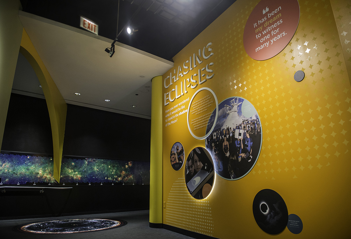 The exhibit illustrates what a solar eclipse is, simulates the eerie experience of an eclipse and explains how eclipses have altered our understanding about our place in the universe over time.