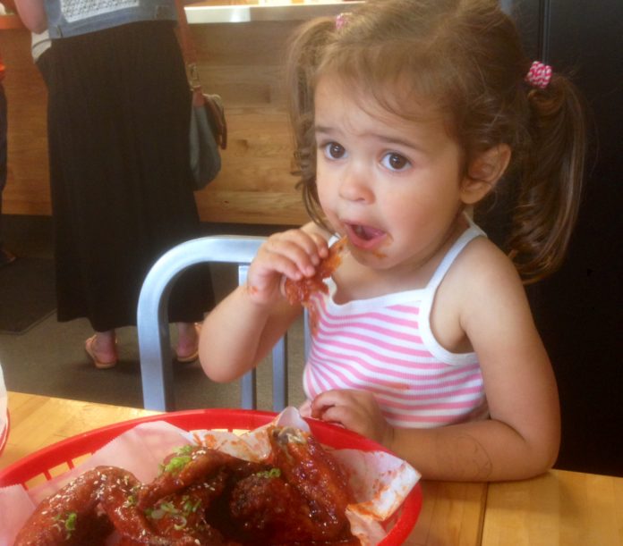Each week after her toddler gymnastics class, my daughter Viva and I go to a restaurant called Dak to have their extremely spicy Korean wings. She throws them back like other toddlers eat mac and cheese and Teddy Grahams, and she laughs while she does it. Last week, four college types came in and were contemplating their order. One suggested the spicy wings, but another said, “Those are way too spicy for me, bro.” I had to do it. I turned around and said, “Which wings? These wings?” and pointed at Viva, who was covered in the red chili infused sauce and giggling while making discarded bones into a sculpture. The frat boy was chagrined and got no end of grief from his friends that a toddler could out-eat him in the spicy food category. My buttons nearly popped off with pride. (And from too much chicken.)